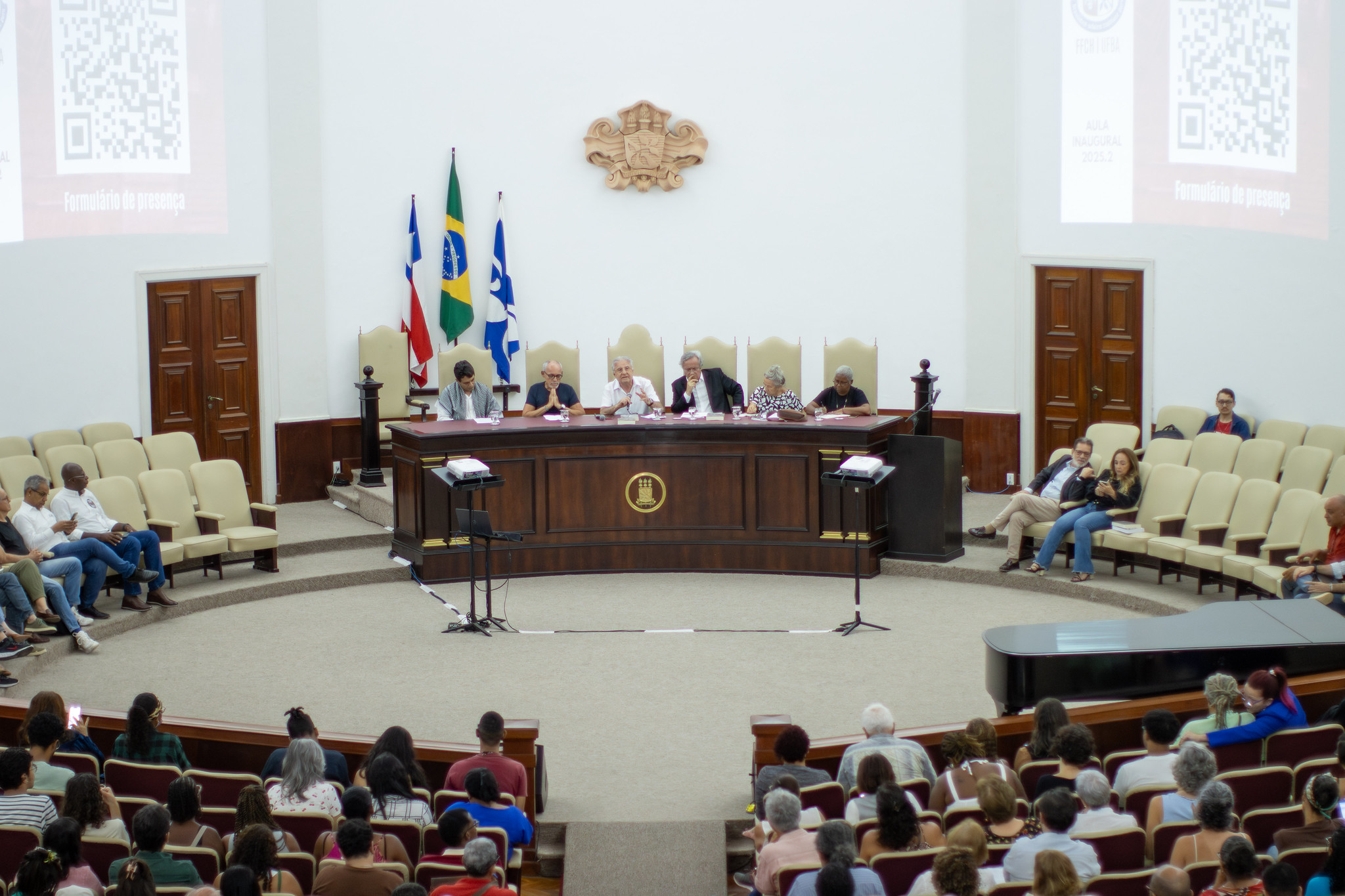 O debate “Crise da democracia brasileira e os impactos sobre a Universidade” reuniu a comunidade acadêmica da UFBA no Salão Nobre da Reitoria, na manhã da última quarta-feira (17). A atividade, promovida pela Faculdade de Filosofia e Ciências Humanas (FFCH), marcou o início do semestre letivo 2025.2.